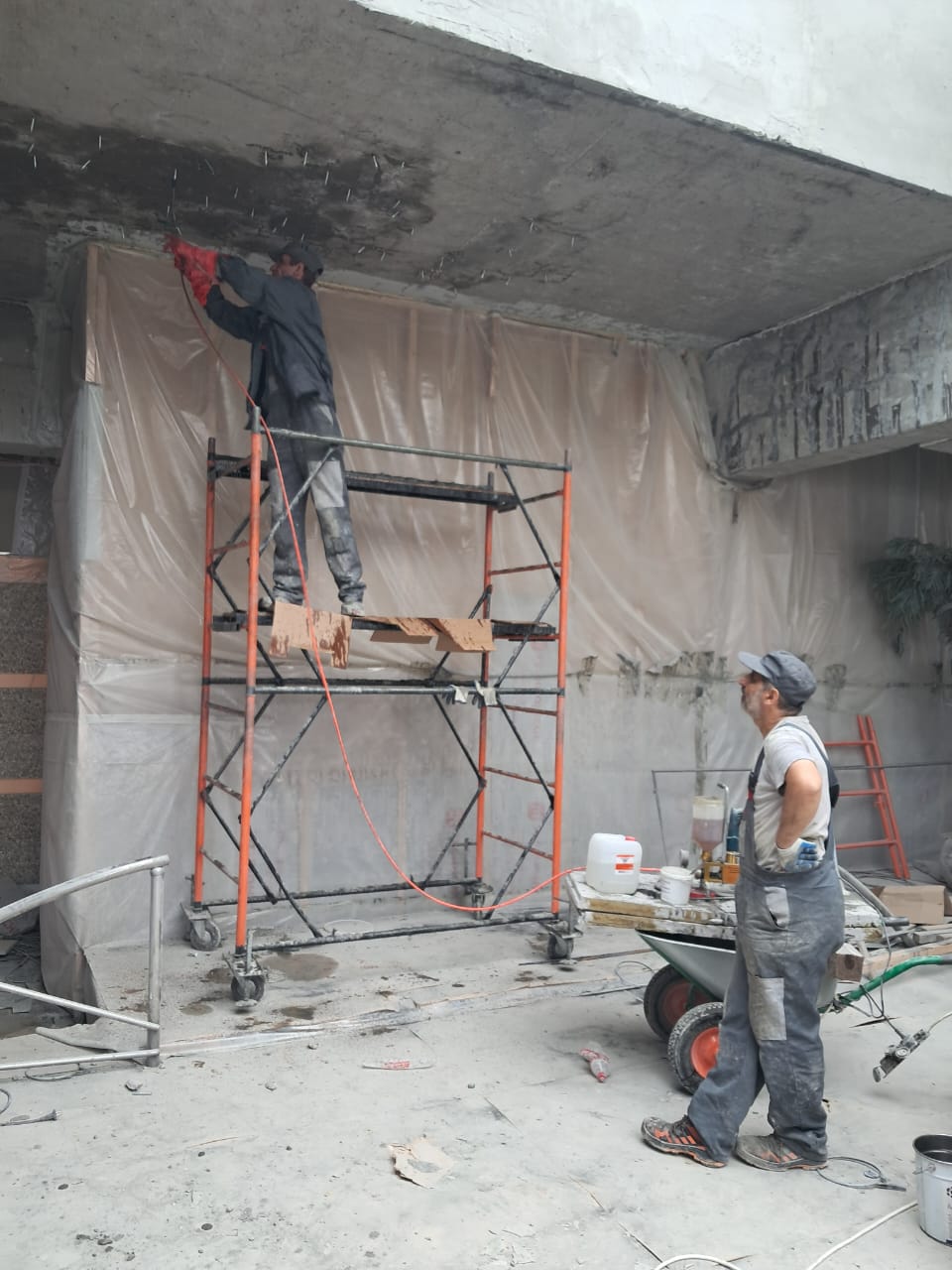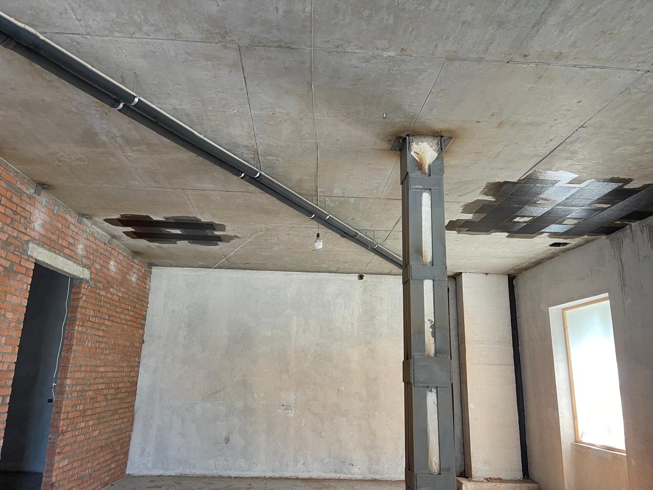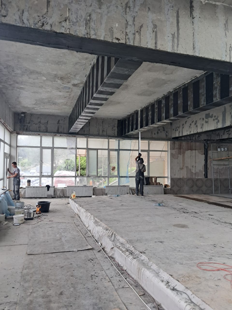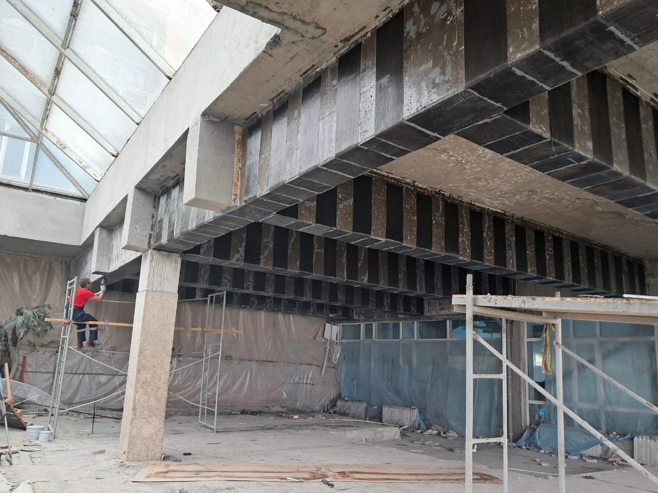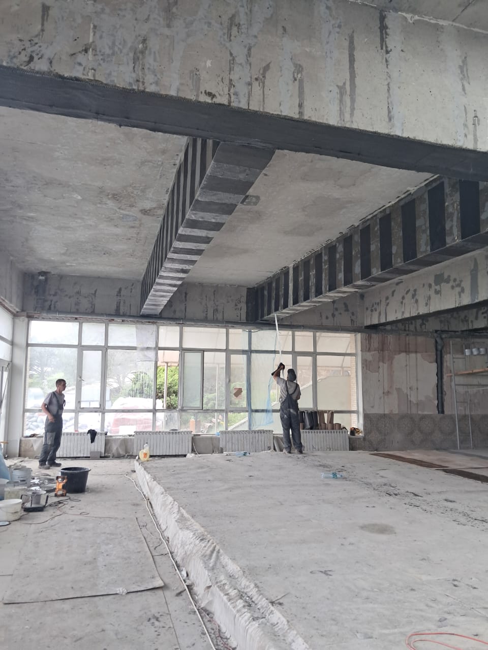 Демонтаж разрушенного защитного слоя бетона на плите перекрытия и зачистка арматуры от ржавчины. Покрытие очищенной арматуры антикорозионным составом. Усиление несущей способности ригельных балок перекрытия методом иньектирования эпоксидных смол в трещины.